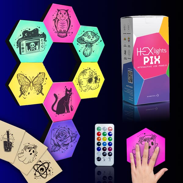 These interactive and customizable LED HEXlights Pix provide endless fun for girls of all ages! Includes 7 individual LED hexagon light tiles that connect into endless shapes and designs. Add a pop of creativity and accessorize with kid-friendly stickers. These colorful and calming lights are autistic-friendly and perfect for sensory rooms.