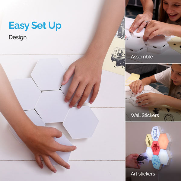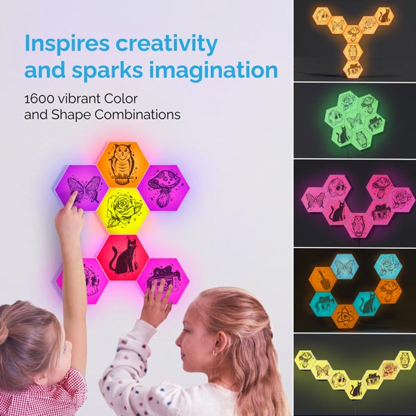 Plug and play with our touch-activated DIY hexagon lighting. Our kid-friendly light kit is perfect for creative thinking, after-school focus, relaxing bedtime lighting, and interactive fun and is enjoyed by children with autism and sensory sensitivities. Countless color options provide a visual and soothing lighting experience that helps those with sensory sensitivities create, connect, and unwind.