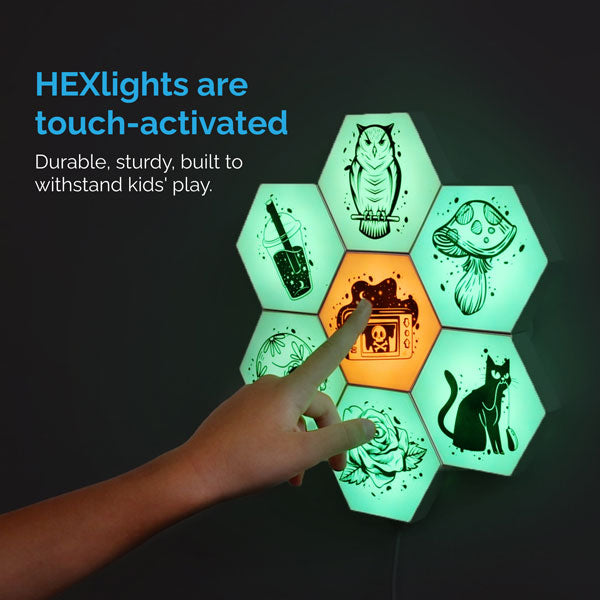 Our HEXlights Pix lighting kit includes 7 hex panels that your child can configure into endless shapes and designs. Interactive and illuminating, tap and remote-controlled lighting lets your child's creativity shine and play with purpose! Say goodbye to boring walls and let your child enhance their bedroom or play area with fun and colorful lighting.
