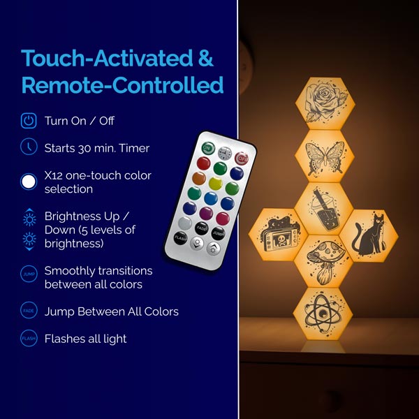 Our LED HEXlights Pix lighting is touch-activated and ready to brighten up or chill out your children’s hangout space or bedroom! Touch-controlled hexagon lights let your child explore vibrant colors for a fun and interactive lighting experience. Tap to change colors, or use the remote to adjust brightness, switch color modes, and set timers for morning and night.